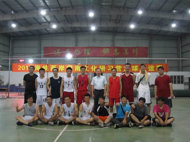 7月14日晚,“2013海峡两岸闽南文化研习营篮球友谊赛”在球类馆举行。 闽南文化研究院副院长邓文金、施榆生,台南大学国语文学系洪琼芳、金门大学王怡超等领队教师以及其他参加研习营的教师和同学都来到比赛现场,为双方代表队员加油助威。现场师生掌声、喝彩声不断,加油声此起彼伏,最后比赛在欢呼声中落下帷幕。