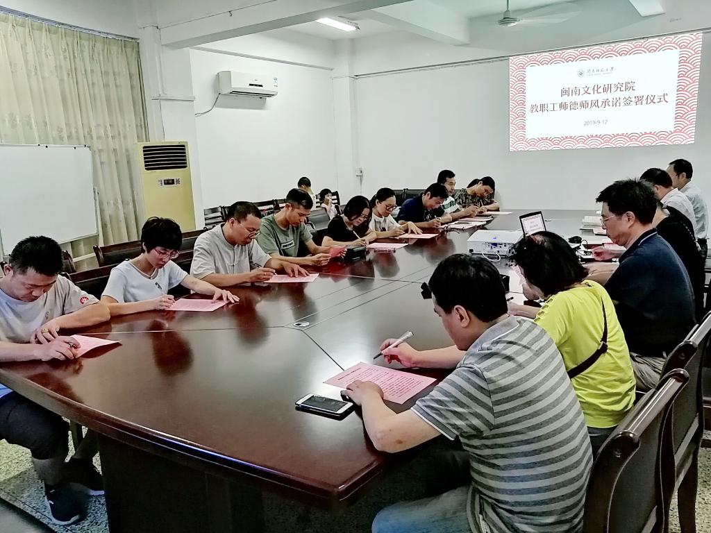 9月12日下午5时,闽南文化研究院在综合楼中区109开展了教职工师德师风签署仪式。闽南文化研究院全体教职工参加了此次签署仪式。此次签署仪式由闽南文化研究院副院长刘云主持。