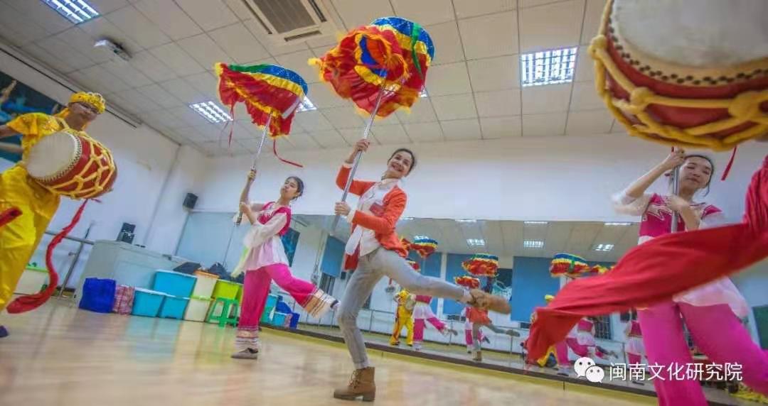 (郑教授在特色选修课堂上教授闽南民间舞蹈,培养学生艺术素养)