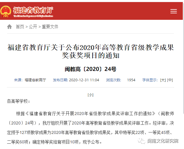 据悉,福建省教学成果奖是福建省教育领域政府类的最高级别奖项。2020年省级教学成果奖评审工作旨在全面贯彻落实习近平新时代中国特色社会主义思想和全国、全省教育大会精神,奖励取得教育教学成果的单位和个人,鼓励教育工作者从事教育教学研究,提高教学水平和教育质量。本次评审共选出福建省高校高等教育省级教学成果奖127项,其中特等奖22项、一等奖45项、二等奖60项。