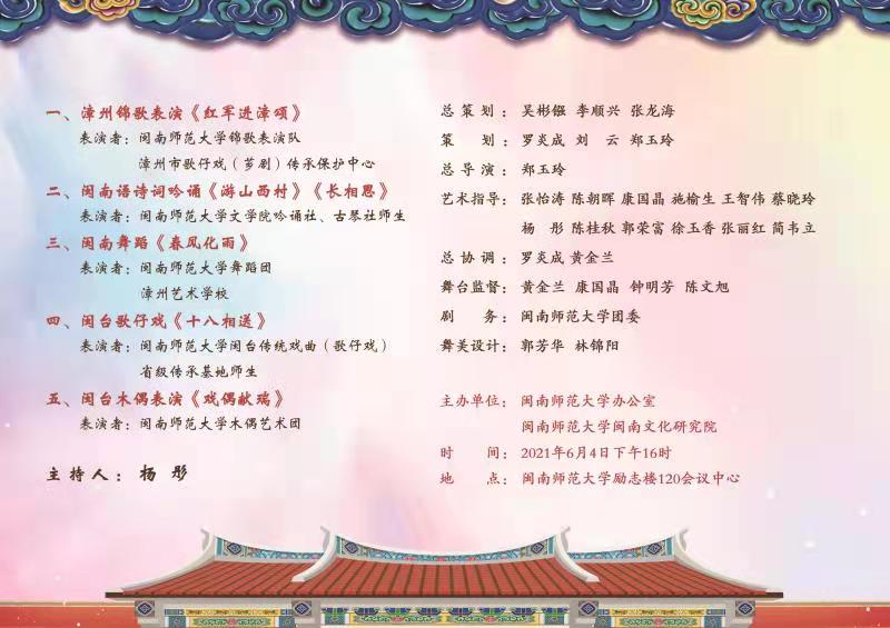 闽台传统艺术是中华优秀传统文化的重要组成部分,是两岸人民共同的精神财富。近年来,我校充分发挥地缘优势,积极挖掘闽南文化资源,着力构建闽南文化特色人才培养体系,以闽南文化为纽带,持续推动两岸文化的交流与合作,在促进两岸融合发展中发挥积极作用。本次闽南文艺集锦展演以“弘扬闽南传统文化,促进两岸文化交流”为主题,由学校办公室、闽南文化研究院共同主办,展演旨在传承、推广闽南文化,弘扬闽台传统艺术,推动两岸文化交流与合作。