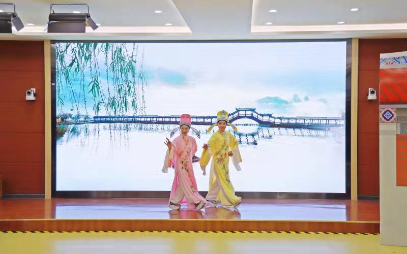 展演活动在锦歌表演《红军进漳颂》中拉开序幕,优美流畅的曲调咏唱出毛主席在土地革命战争时期率领红军取得攻克漳州的伟大胜利。随后,校吟诵社、古琴社师生带来闽南语诗词吟诵《游山西村》《长相思》,娓娓道出闽南地区的乡音古韵。闽南舞蹈《春风化雨》以柔美的舞姿展现了春风吹拂、春雨滋养、化育万物的家乡美景,寄托了游子的思乡情怀和对家乡的美好祝福。歌仔戏《十八相送》,师生们用悠扬动听的唱腔再现了中华戏曲的经典神韵。校木偶艺术团带来的《戏偶献瑞》展示了闽台布袋木偶、提线木偶、杖头木偶等多项优秀传统艺术。杖头木偶表演的长绸舞行云流水、灵动飘逸,木偶变脸、提线木偶踩自行车等绝活特技精彩纷呈。表演者操纵木偶现场书写“闽南文化”四个大字,将主题展演的气氛推向高潮,赢得阵阵热烈掌声。