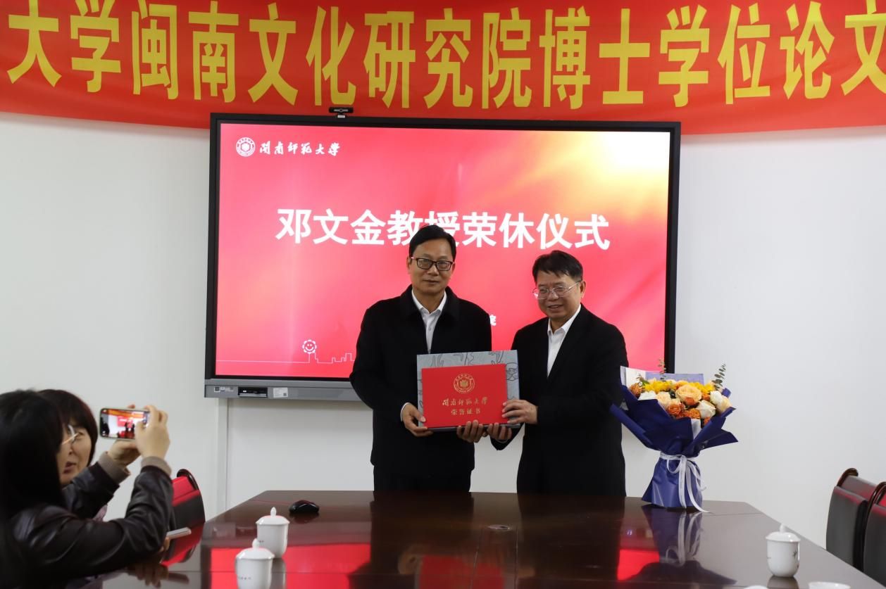 2025年12月31日上午,闽南文化研究院在综合楼中区109会议室隆重举行邓文金教授荣休仪式。全院教职工齐聚一堂,共同见证这一温馨而庄重的时刻,向邓文金教授致以崇高敬意和诚挚祝福。仪式由闽南文化研究院院长刘云主持。