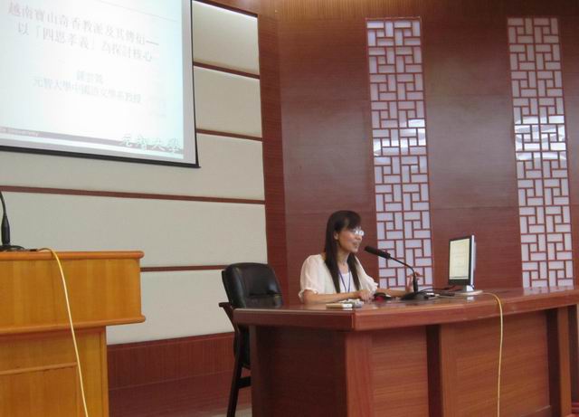 元智大学钟云莺教授讲座题目为“越南宝山奇香教派及其传衍——以‘四恩孝义’为探讨核心”。钟教授以越南地方教派“宝山奇香教派”为研究视点,阐述中华佛教文化对“宝山奇香教派”形成的影响。虽是一个地域性研究课题,但是深厚的田野调查基础却为我们展示了精致、深入的研究成果;让听众感受到中华文明元素对非华人社区的深刻影响及汉字文化圈的存在。钟教授还结合自身求学经历谈了田野调查在学术研究中的重要性。
