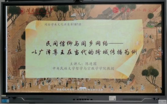 2024年5月20日上午,中央民族大学哲学与宗教学学院教授、博士生导师陈进国先生应闽南文化研究院邀请,在9号楼210会议室作题为“民间信仰与同乡网络——以广泽尊王在当代的跨域传播为例”的专题学术讲座。讲座由刘云院长主持。