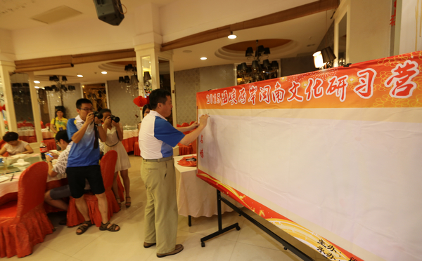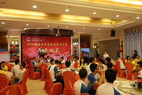 7月2日晚,由我校主办的2015年海峡两岸“闽南文化研习营”开营仪式在漳州华侨饭店开营,来自台湾大学、台湾师范大学、中央大学、台南大学、政治大学、铭传大学、高雄第一科技大学、金门大学、明道大学、嘉南药理大学等10所台湾高校60多名师生及厦门大学、我校部分师生代表等共80余人参与研习、互动和交流。校党委书记林晓峰、副校长萧庆伟,漳州市台办副主任陈建英、市政协文史委主任涂志伟、市台联副会长陈敬收、市金门同胞联谊会副会长吴美珠等领导出席开营式。