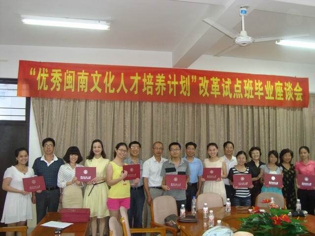 2013年6月26日上午,校“优秀闽南文化人才培养计划”改革试点班学生毕业座谈会在六楼会议室举行。教务处处长陈再生、闽南文化研究院副院长邓文金、学报编辑部主任郑镛、试点班任课老师代表及2009级首届试点班学生参加了此次座谈会。座谈会由闽南文化研究院副院长邓文金主持。