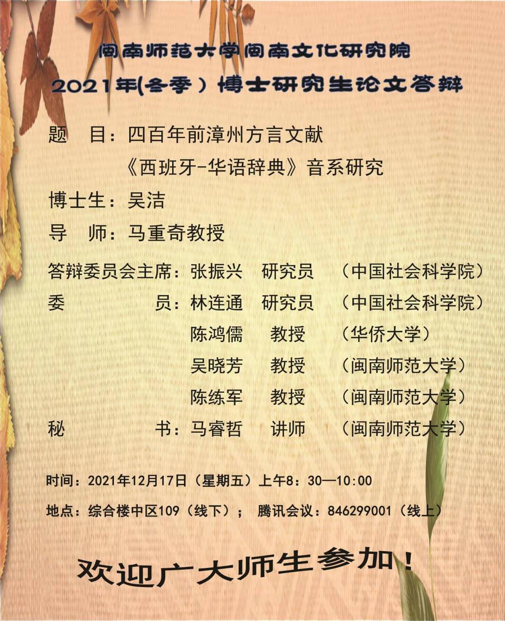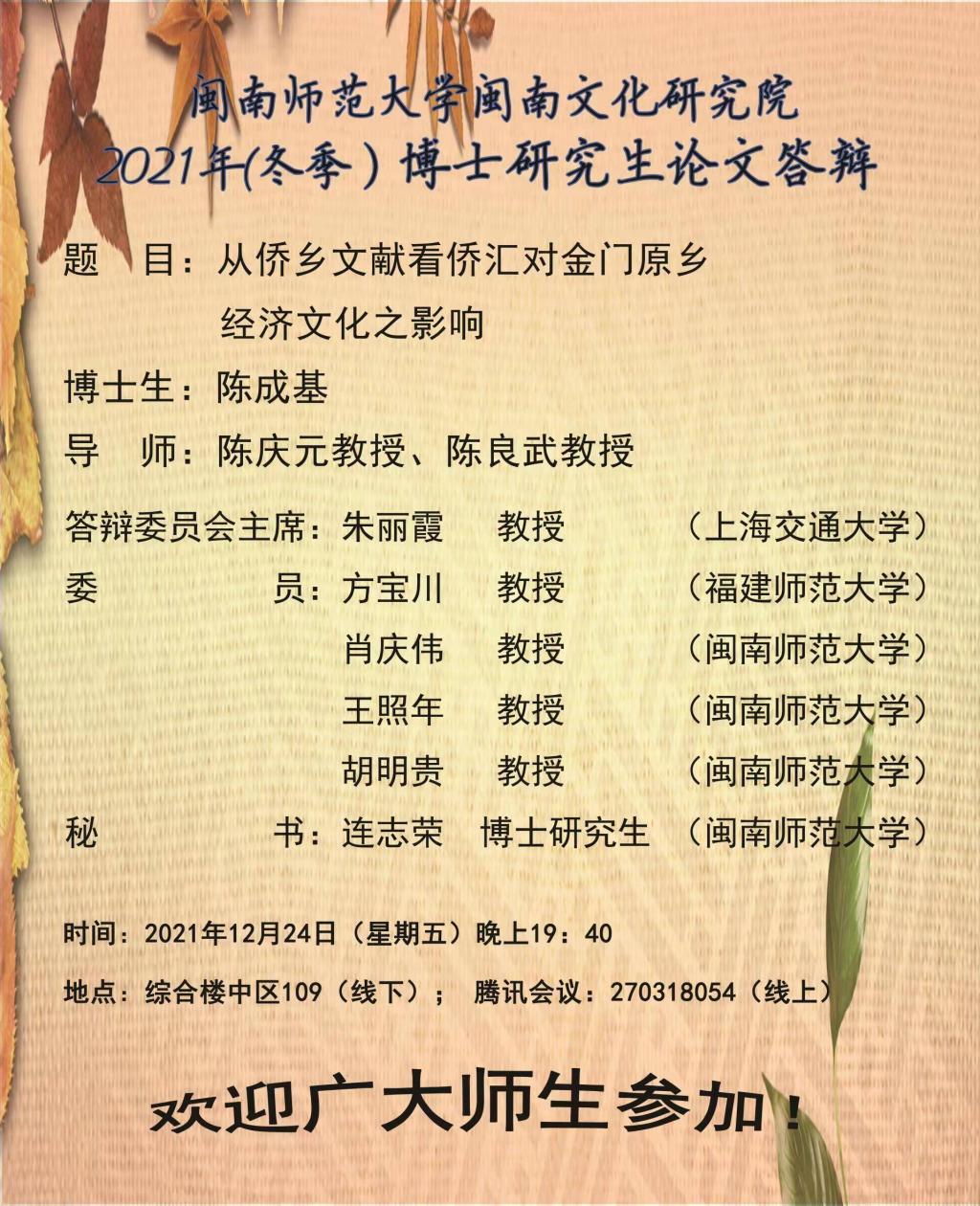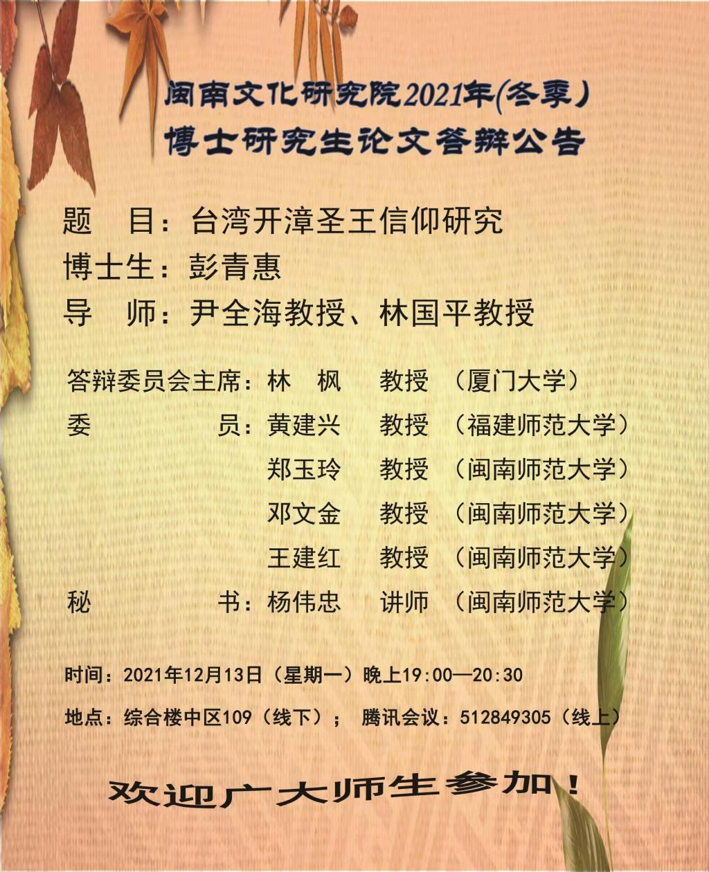 2138cn太阳城集团闽南文化研究院2021年(冬季)博士研究生学位论文答辩公告