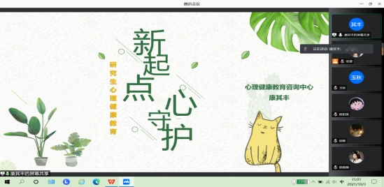 (通讯员:张捷)为加强研究生心理健康教育,提高研究生心理健康水平和心理调适能力,校心理健康教育咨询中心康其丰老师于103日下午三点在腾讯会议平台上,面向闽南文化研究院全体研究院讲了题为“新起点,心守护——研究生心理健康教育”的心理辅导课。